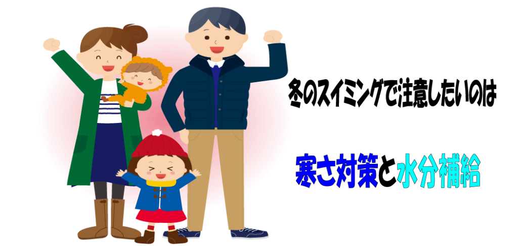 冬のスイミングで注意したいのは寒さ対策と水分補給です。